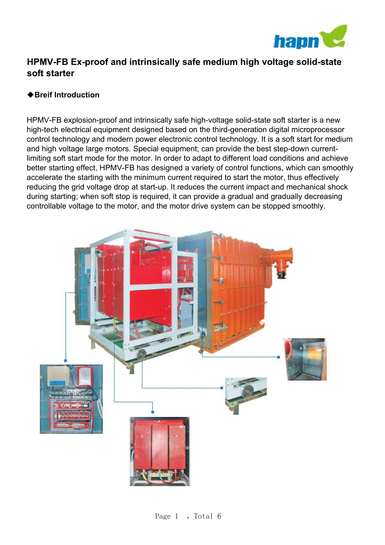 HPMV-FB explosion-proof and intrinsicallysafe high-voltage solid-statesoftstarteris a newhigh-tech electricalequipment designed based on the third-generation digital microprocessorcontrol technology and modern power electronic control technology. It is a soft start for mediumand high voltage large motors. Special equipment; can provide the best step-down current-limiting soft start mode for the motor. In order to adapt to different load conditions and achievebetter starting effect, HPMV-FB has designed a variety of control functions, which can smoothlyaccelerate the starting with the minimum current required to start the motor, thus effectivelyreducing the grid voltage drop at start-up. It reduces the current impact and mechanical shockduring starting; when soft stop is required, it can provide a gradual and gradually decreasingcontrollable voltage to the motor, and the motor drive system can be stopped smoothly.